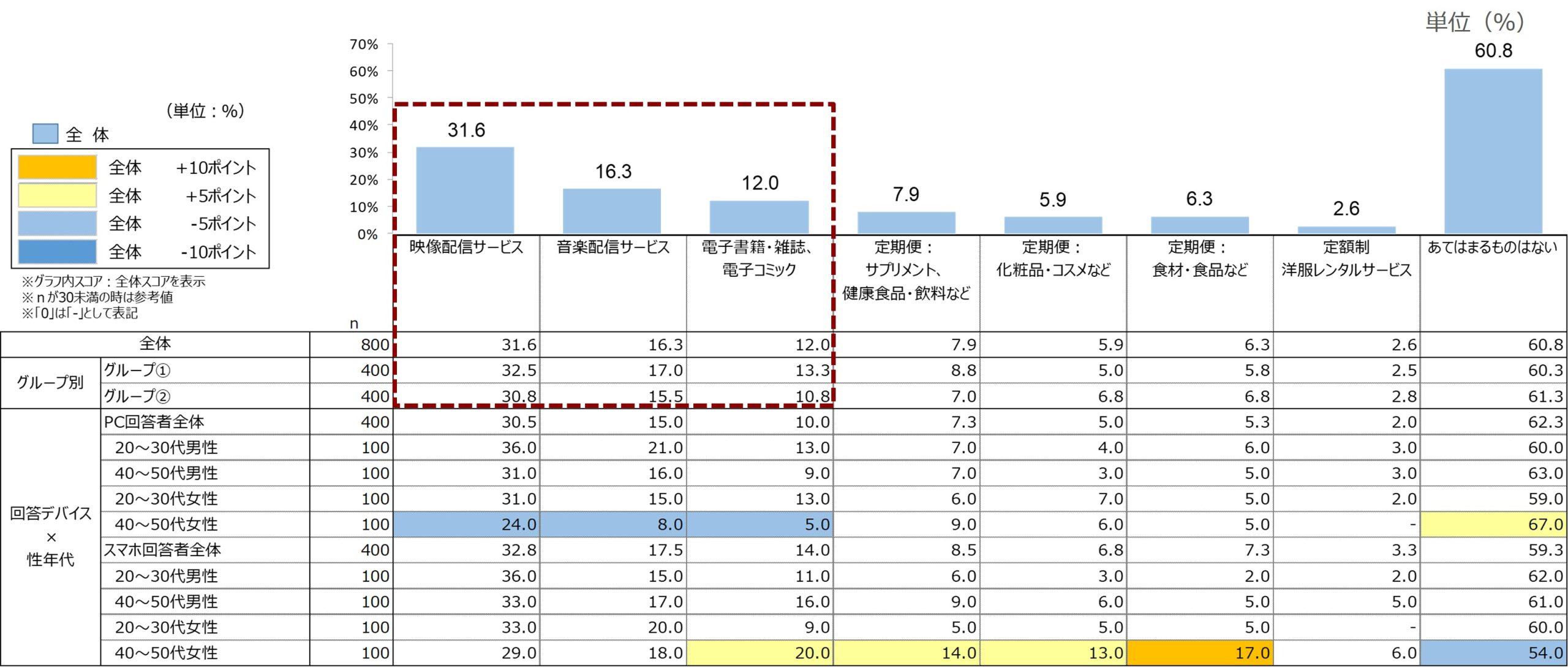 これを実際に行ってみた結果、定額制サービスのニーズとして、「映像配信サービス」が下表のように最も高く3割強でした。次に「音楽配信サービス」「電子書籍・雑誌・電子コミック」が1割台で続きます。