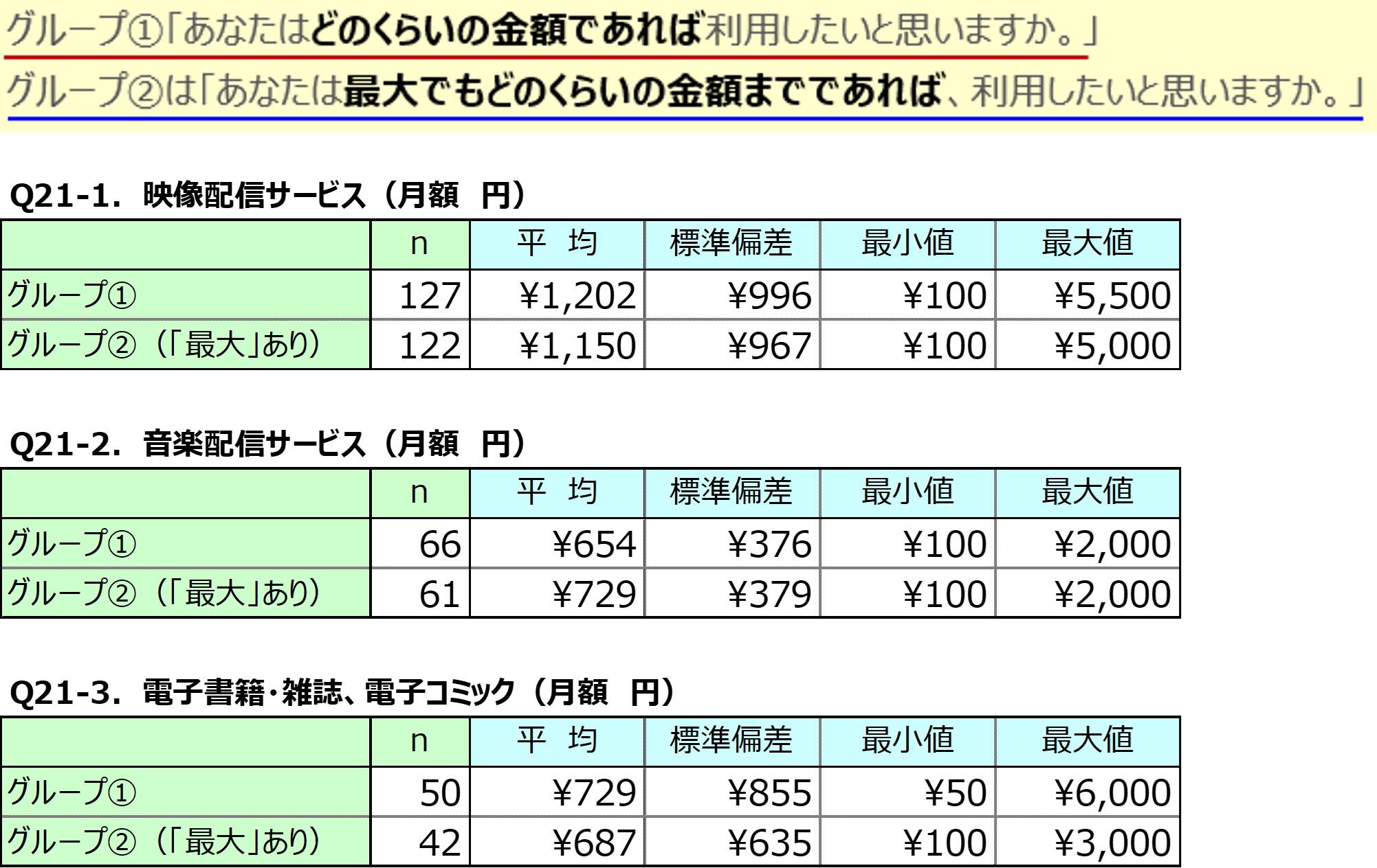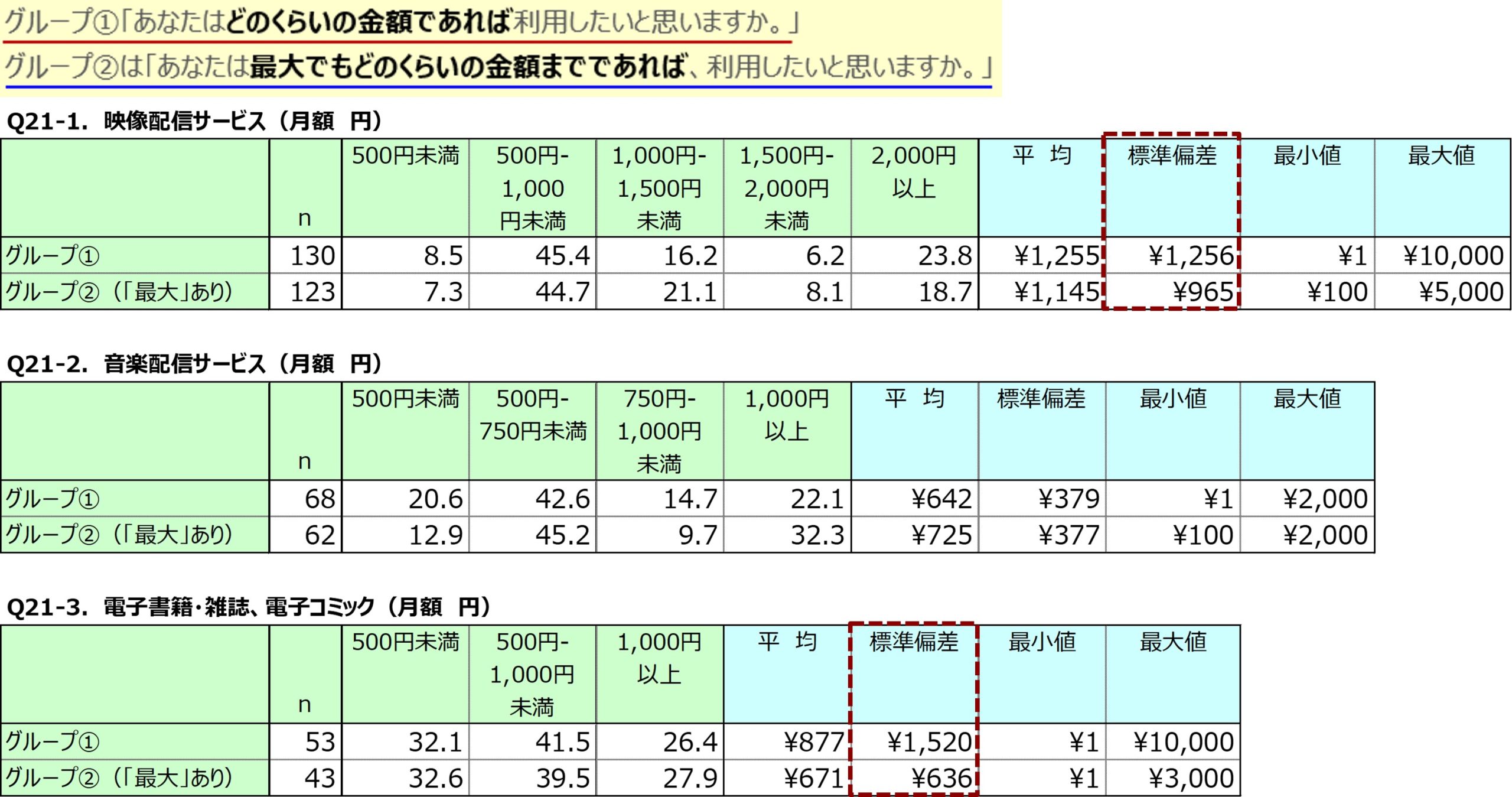 また、利用意向者が少ない定額サービスの場合、nが少数となってしまい、グループ間の差以上にグループ内での個人差による影響が大きくなってしまう懸念があるため、利用意向者が10%を超えた3つのジャンル「映像配信サービス」「音楽配信サービス」「電子書籍・雑誌・電子コミック」に絞り、金額データを比較することにしました。そうして比較をしてみると、「映像配信サービス」「電子書籍・雑誌、電子コミック」において、下表のようにグループ②(「最大」ありのグループ)の標準偏差がグループ①より小さい、という結果が得られました。