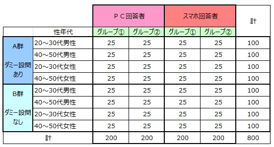 補足として、割付は性年代20~30代男性、40~50代の男性と分けており、さらにA群・B群があります。このA群・B群の割付は、別記事で解説する検証にて用いる予定であり、本記事では触れませんのでご了承ください。