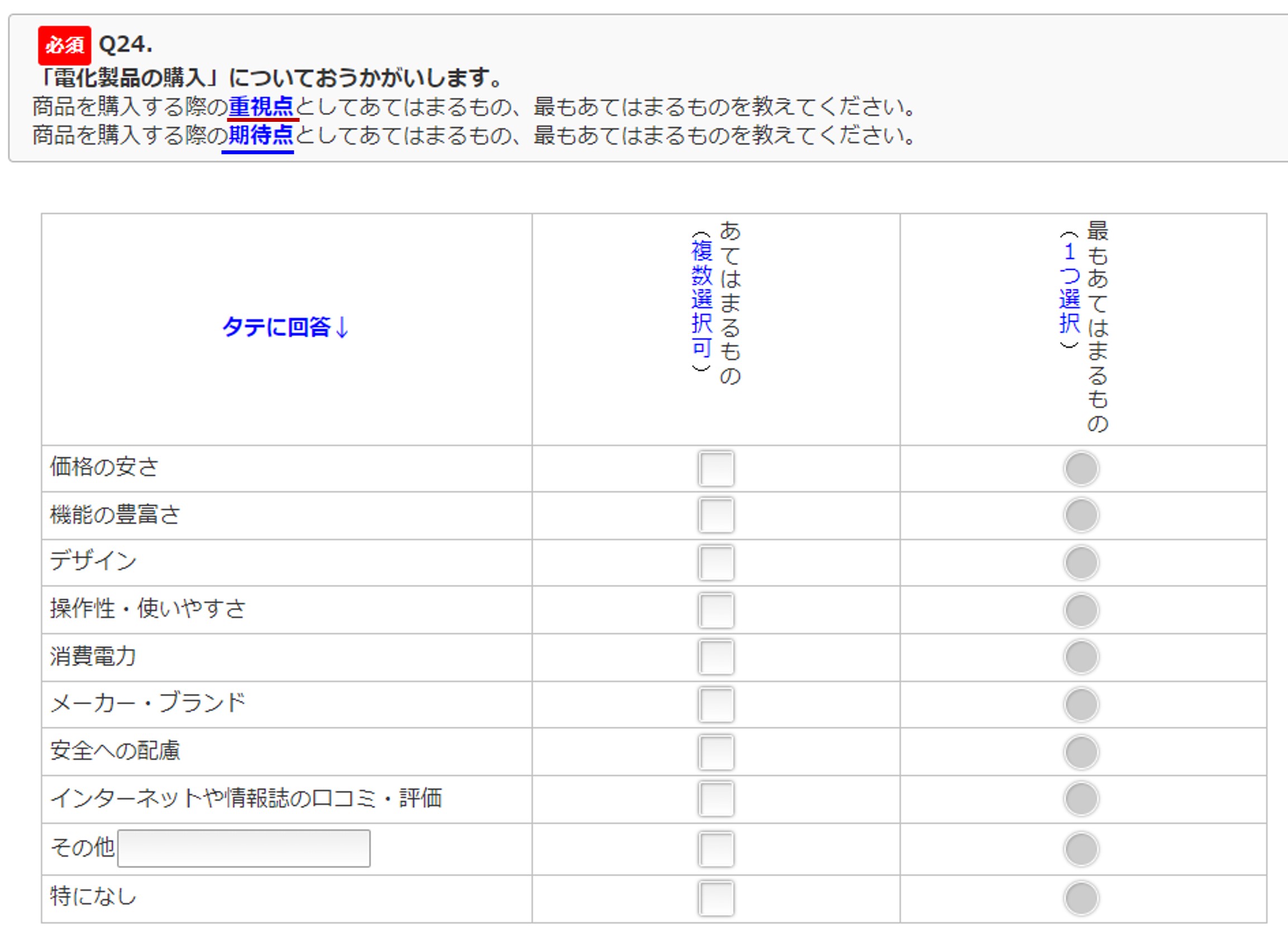 この設問は、「電化製品の購入」というところで、ある程度お答えやすい内容だと考え用意しました。これを実際に行ってみると、以下図のように①「重視点」、②「期待点」の両グループで回答傾向は、似通う結果となりました。