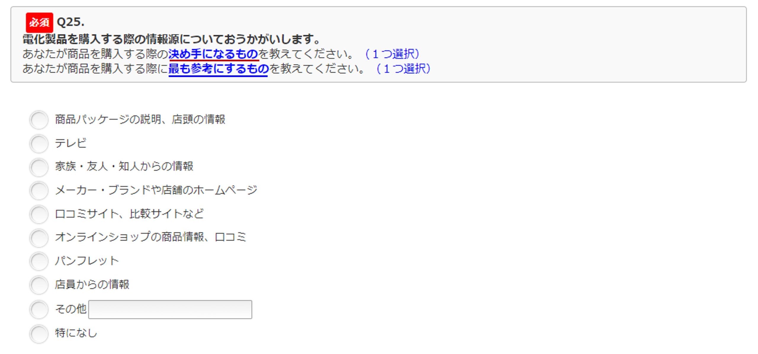 こちらも、「決め手になったもの」と「最も参考にしたもの」という言葉の違いで、回答傾向が違うのか調査するために、以下のようにグループ①、②で提示する文章を分けました。