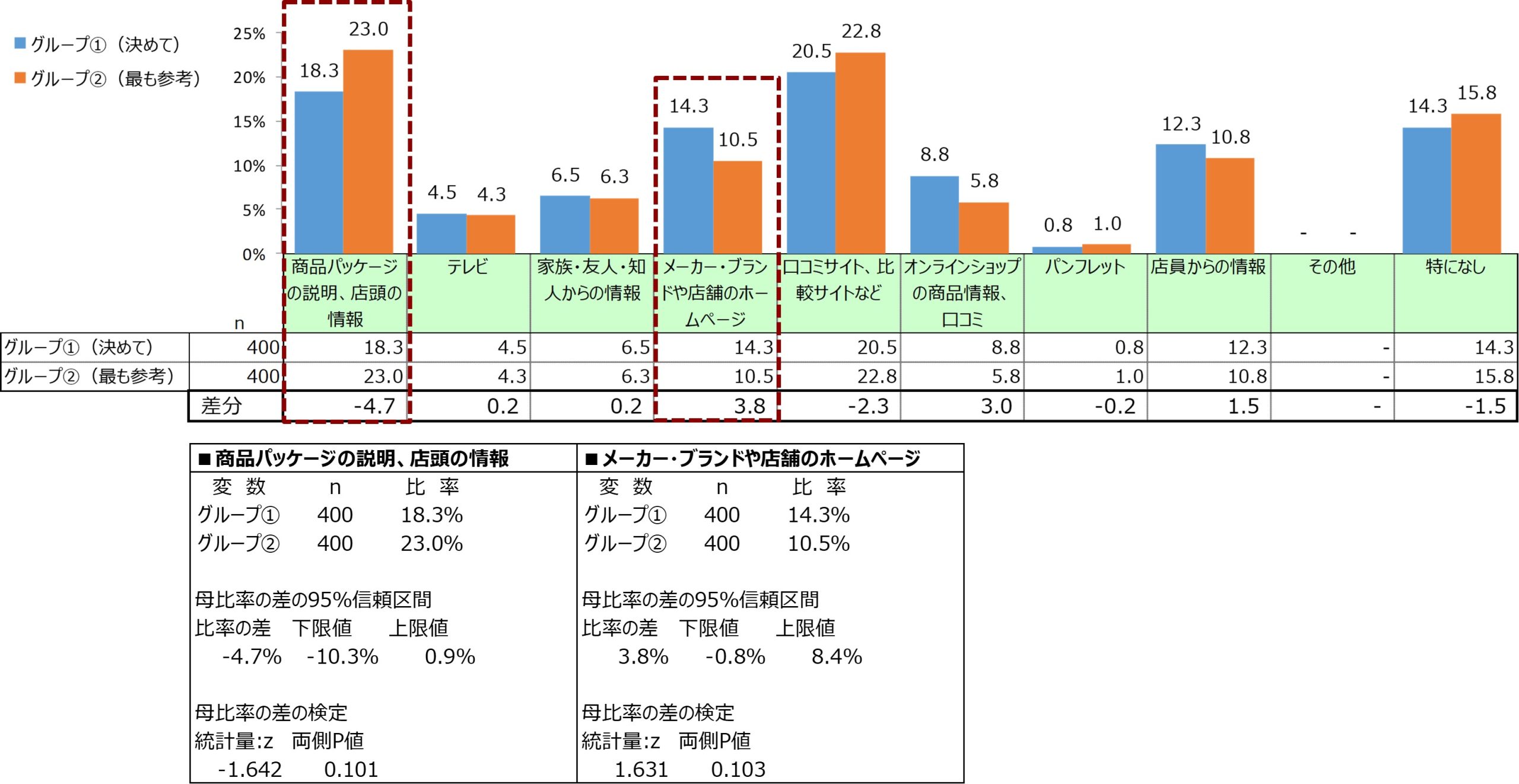 そして、ややスコアに差がみられたのは「商品パッケージの説明、店頭の情報」で-4.7pt、「メーカー・ブランドや店舗のホームページ」の3.8ptでした。こちらも先ほど同様検定をしてみると、統計的に有意な差とは言えない結果となり、「決め手になるもの」「最も参考にするもの」という聞き方の違いで、回答に大きな違いがでることはないと考えることにします。