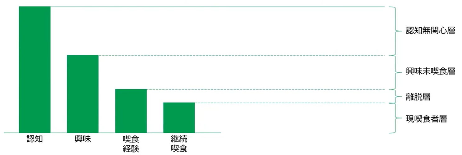 | 興味未喫食者層 | 興味はあるが、購入に至っていない方となり、「買う機会がなかったか」、「買うに至らない要素は何なのか」というのを探っていきます。いわゆる未顧客が「なんでこの方たちが買う要素がないのか」、「興味持っているが、買わないのは何なのか」というのを伺っていきます。 |