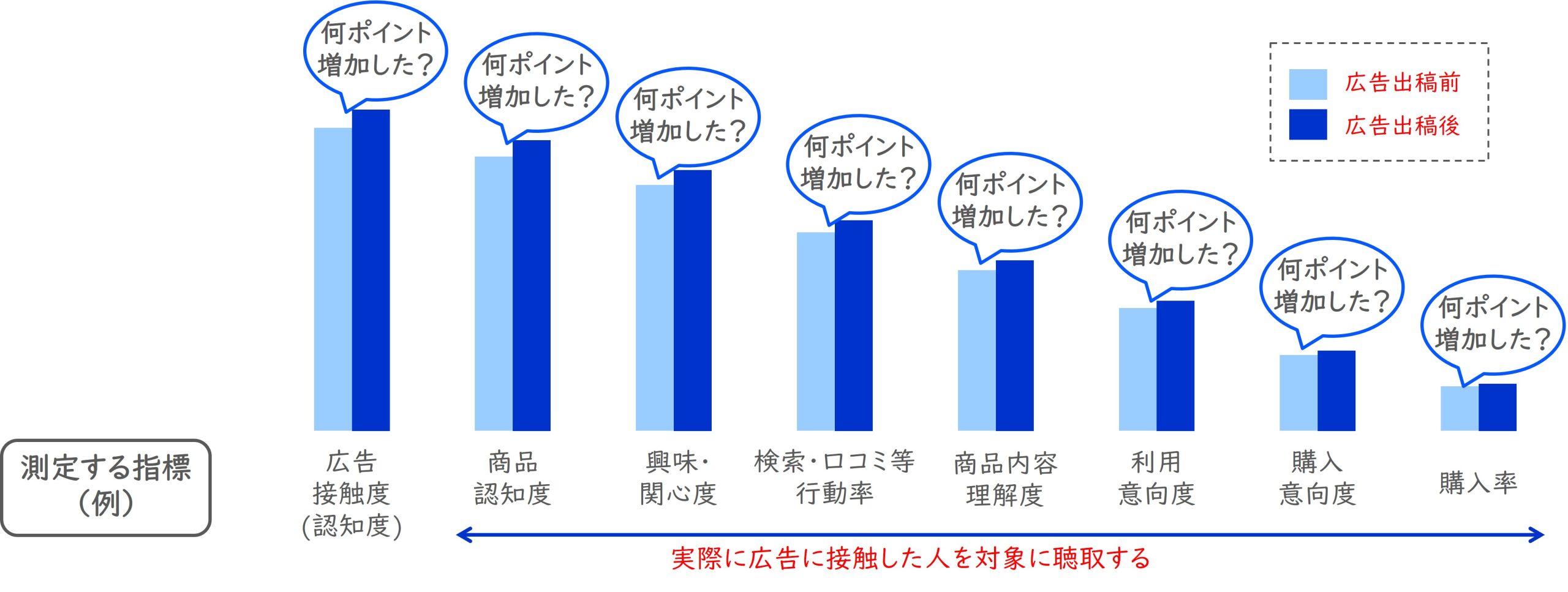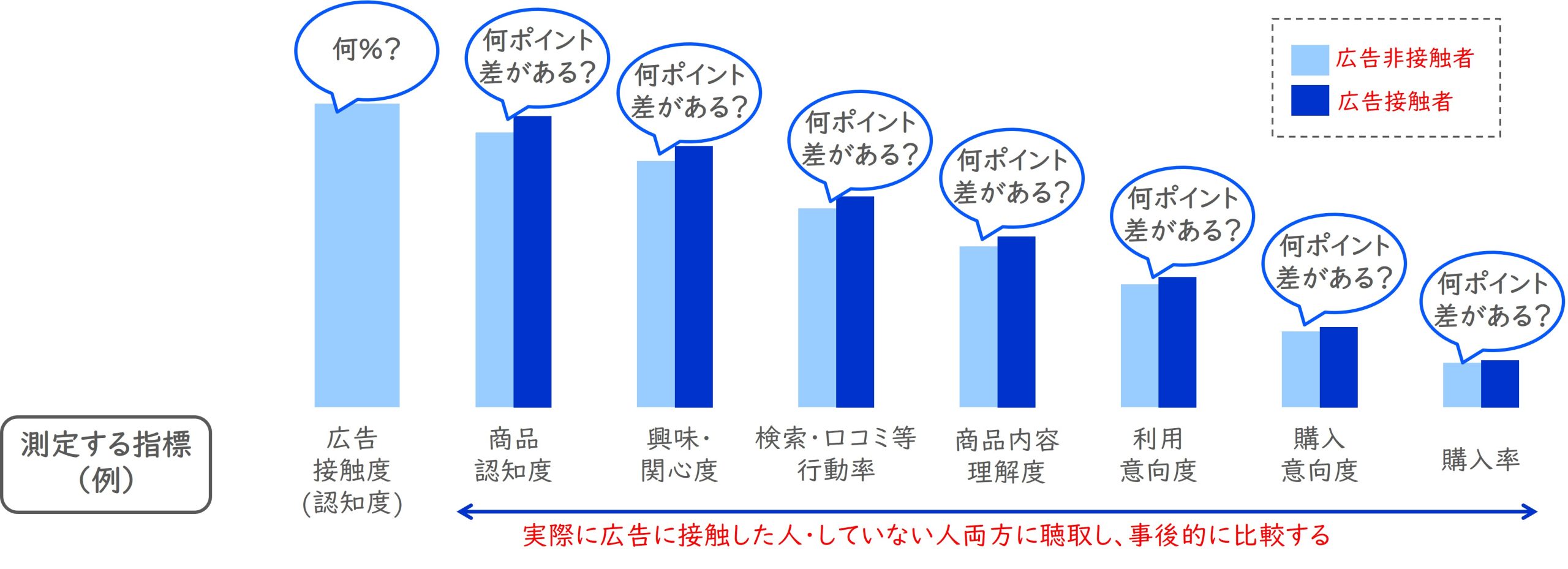| ⑤広告接触者・非接触者で比較する | 実際の意識や行動実態 | 変化率で測定(動的) | 出稿完了直後 (忘却が進まないうちに) |