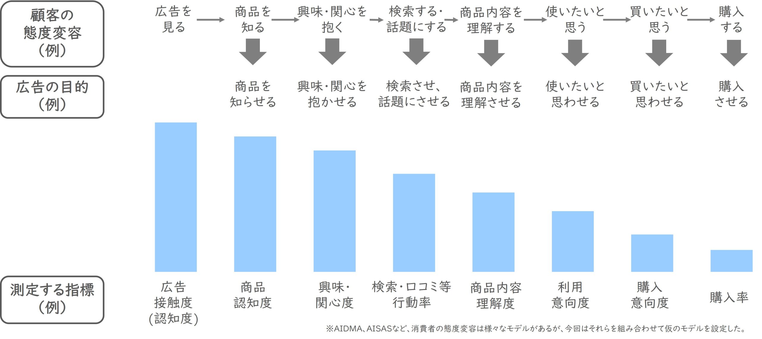 このように考えてみると、広告を打つ目的は、下図の「顧客の態度変容(例)」のように、広告を見ていただいて、最終的に購入していただくのが、ゴールになるかと思います。