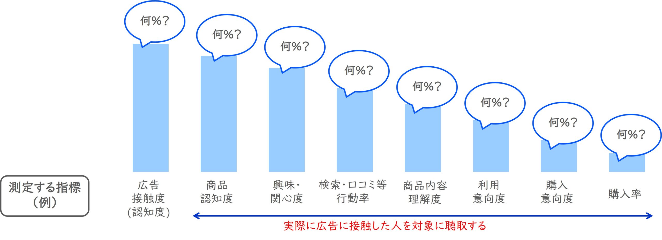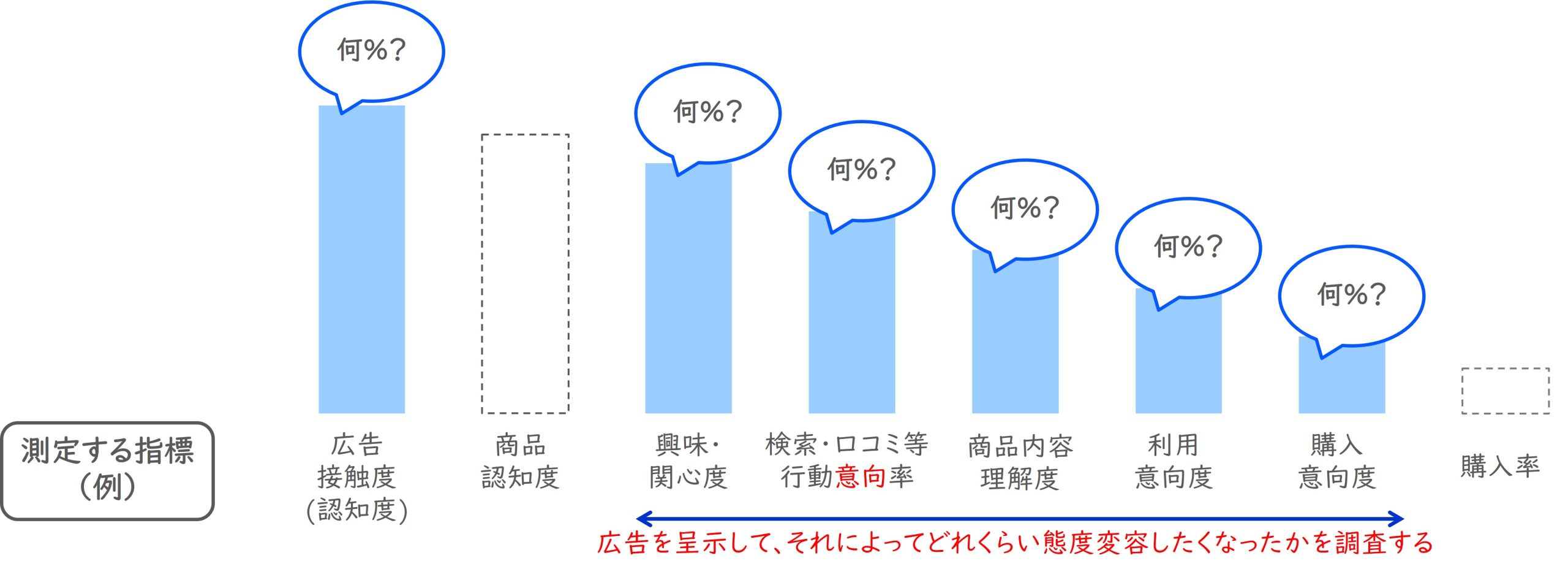 最もシンプルな調査方法は、1回の調査で各指標を直接聴取し、「何%の人にその態度変容を促すことができたのか」を確認することです。特に、商品認知度以降は、実際に広告に接触した人を対象に聴取することになります。