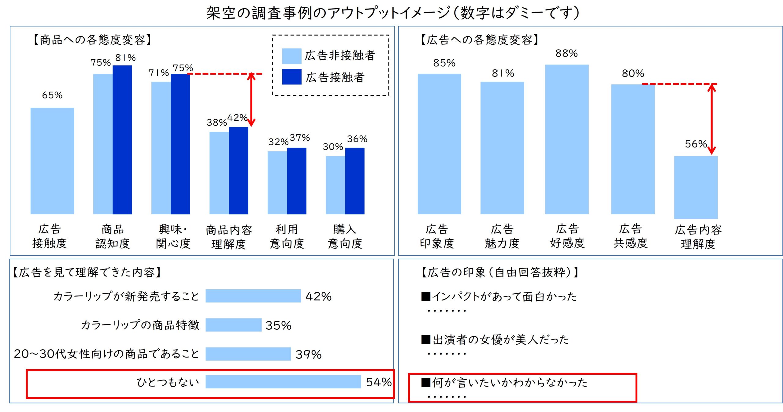 ここまで、広告効果測定調査の目的を「広告の効果を測定」と「広告の内容を評価」の2つ分け、それぞれ調査方法や調査設計、調査項目例を紹介してきました。また、架空の事例を用いて、調査事例についても触れていきました。