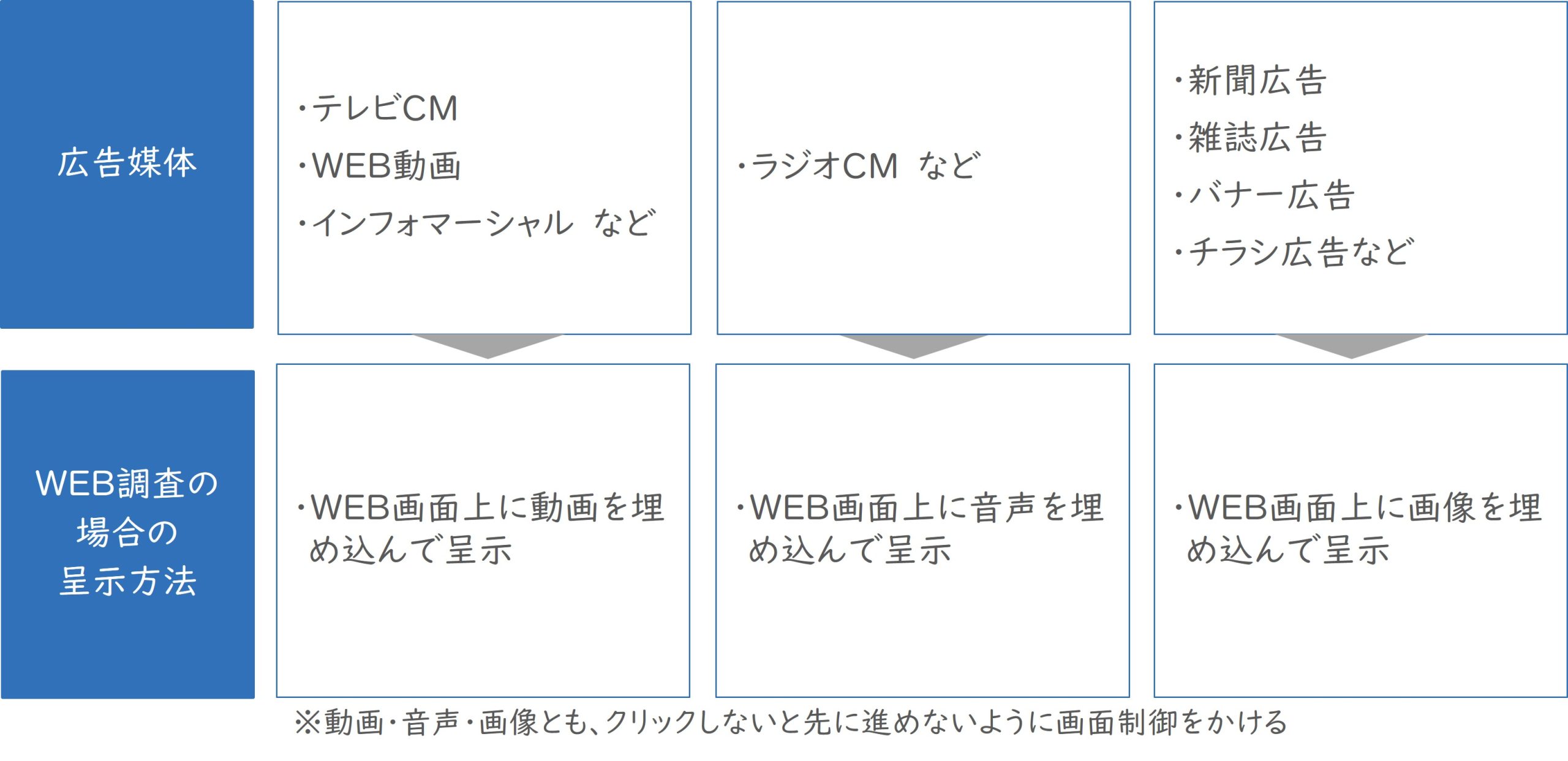 広告媒体ごとにWEB調査の場合の提示方法をまとめた図が下図です。