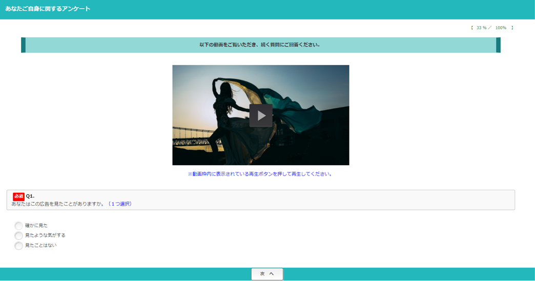 | ③広告を呈示して聴取する | 調査内での意識のみ | 絶対値で測定(静的) | 自由なタイミングで調査可能 ※広告接触率等を聴取しない場合 |