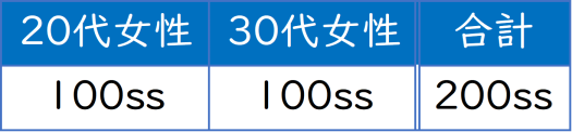 ・サンプルサイズは、通常の調査と同じく、最小分析セグメントのサンプルサイズ×割付数と予算状況で決定 ・サンプルサイズは、通常の調査と同じく、最小分析セグメントのサンプルサイズ×割付数と予算状況で決定 ・割付は、性年代での均等割付か、人口動態に基づいて割り付けることが多い →計200ssで、下表のように割付 ![]() |