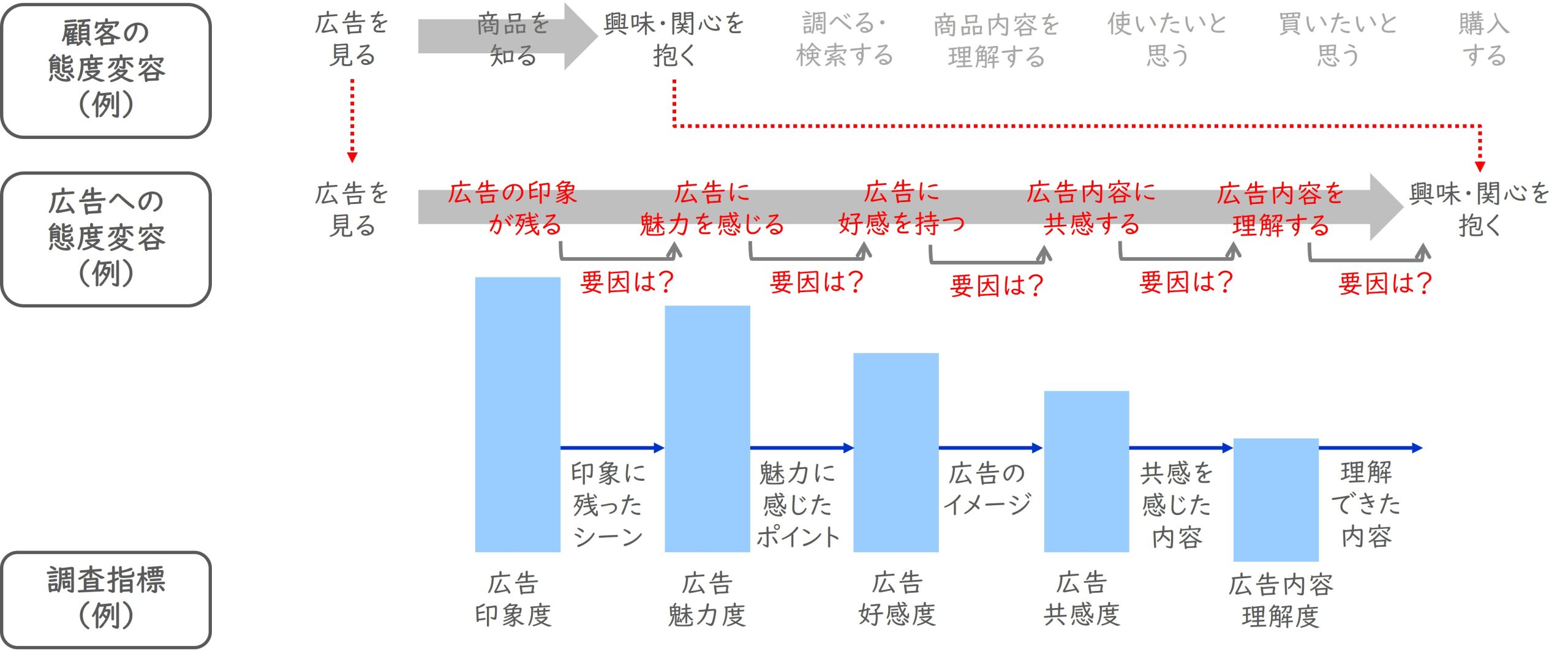 したがって、良い広告は、訴求商品に興味関心を抱かせるために、印象を残し、好意や共感を抱かせ、内容を理解させるなどの態度変容を促していると想定されます。これらの態度変容を促しているかが、広告内容評価の指標となります。更に、その態度変容を起こさせた要因まで確認することが、単純な広告効果測定と異なる点です。