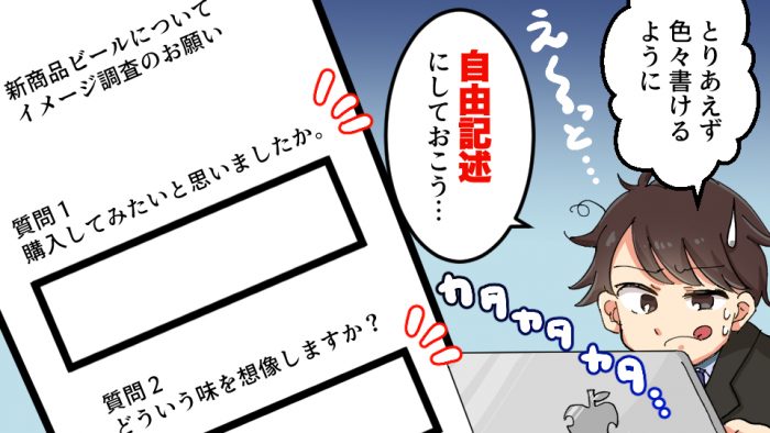 特にアンケートの自由記述はその名の通り、回答者が”自由”に記述するため、回答者の解釈により意図しない回答となることも多いので、回答者ごとに解釈が異ならないように設問文を工夫するようにしましょう。