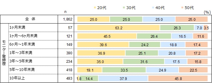 年齢別でみると、予想通りにはなりますが若年層ほどモニター登録歴が短い傾向でした。
