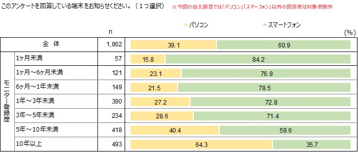 回答しているデバイスをみると、モニター登録歴が短いほど「スマートフォン」、長いほど「パソコン」で回答している様子がみられます。モニター登録歴が10年以上では、6割半ばと半数以上がパソコンで回答されています。
