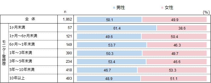 性別でみると、最近登録されたモニター登録歴1ヶ月未満の方は男性が多いものの、全体的にみればほぼ半数ずつです。