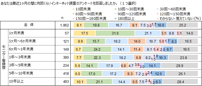 モニター登録歴が1ヶ月を超えると「60回以上」のゾーンも増えてきますが、モニター登録歴が長いほど回答数が多いということではないことが見受けられます。