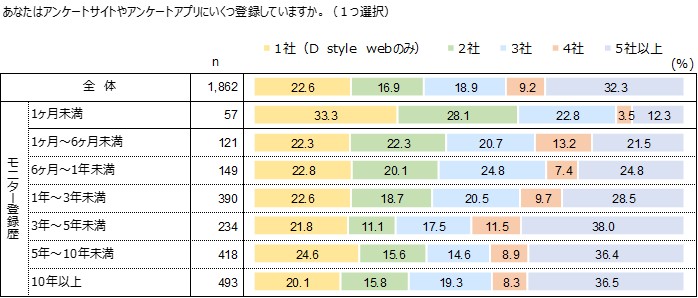 登録しているアンケートサイトやアプリの数をみると、モニター登録歴が1ヶ月以上では、期間に関わらず1社で登録されている方が一定数(2割程度)みられました。