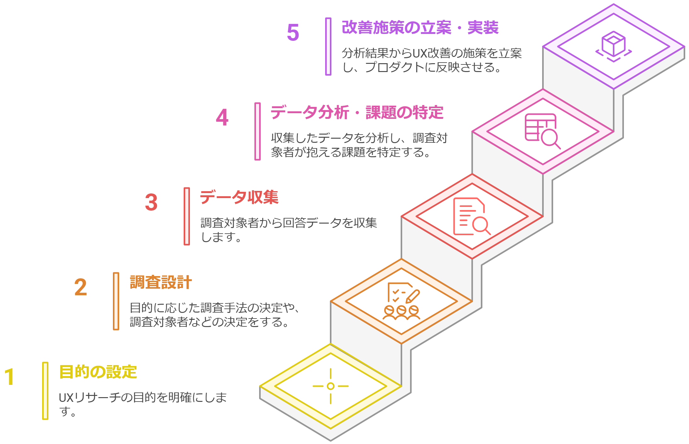 UXリサーチは、製品やサービスをユーザー中心で改善していくために、体系化された手順を踏むことが重要です。一般的なUXリサーチの流れは、以下のようになります。