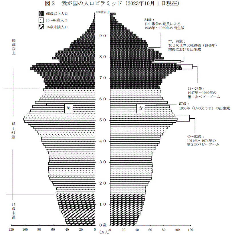 図 日本の人口ピラミッド 引用元:人口推計(2023年(令和5年)10月1日現在)‐全国:年齢(各歳)、男女別人口 ・ 都道府県:年齢(5歳階級)、男女別人口‐