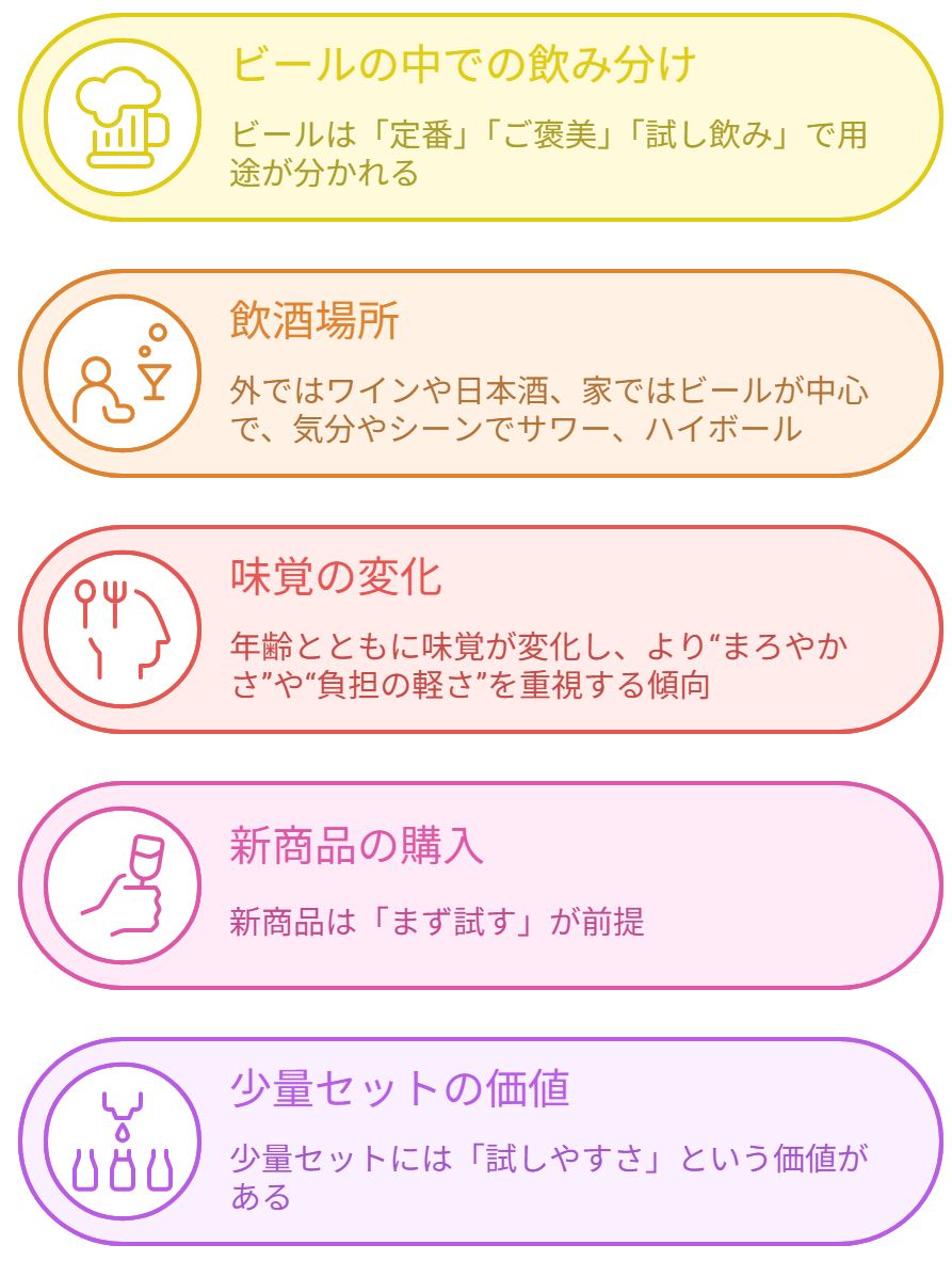 この発言から、この男性は週末の飲酒が「日常の癒し」と「自分への報酬」としての機能を担っている可能性がうかがえます。また、用途によってお酒を切り替える行動は、製品ラインナップの明確な位置づけ(=定番/特別感)に対するニーズを示唆しているかもしれません。
