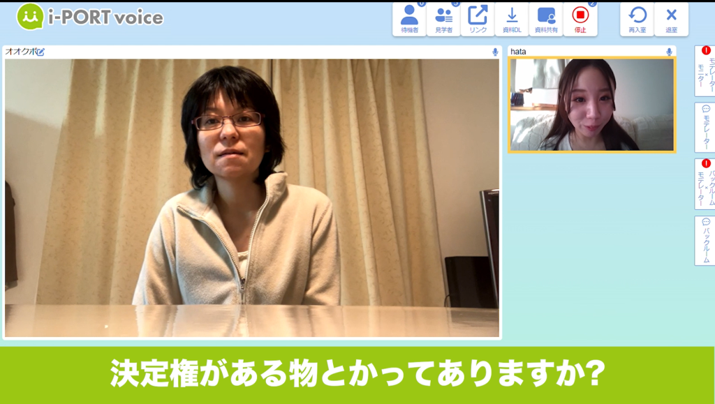 アスマーク(調査会社)が開発したオンラインインタビューシステム「i-PORT voice」。見学者の使いやすさを一番に、定性調査の運営実務に長けた専属のディレクターが、インタビュー導入から終わりまでをフォローします。