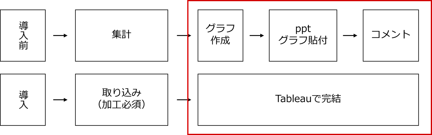 Tableau導入前の業務フローは、集計し、集計表をもとにグラフを作成、それをパワポに貼り付け、そこからコメントを書いて全体を総括しますが、Tableau導入後は、TableauDesktopで一度ダッシュボードを作成してしまえば、データは自動で連携されるので途中の集計業務がごっそり無くなり、PPTへの貼り付け作業も不要になります。