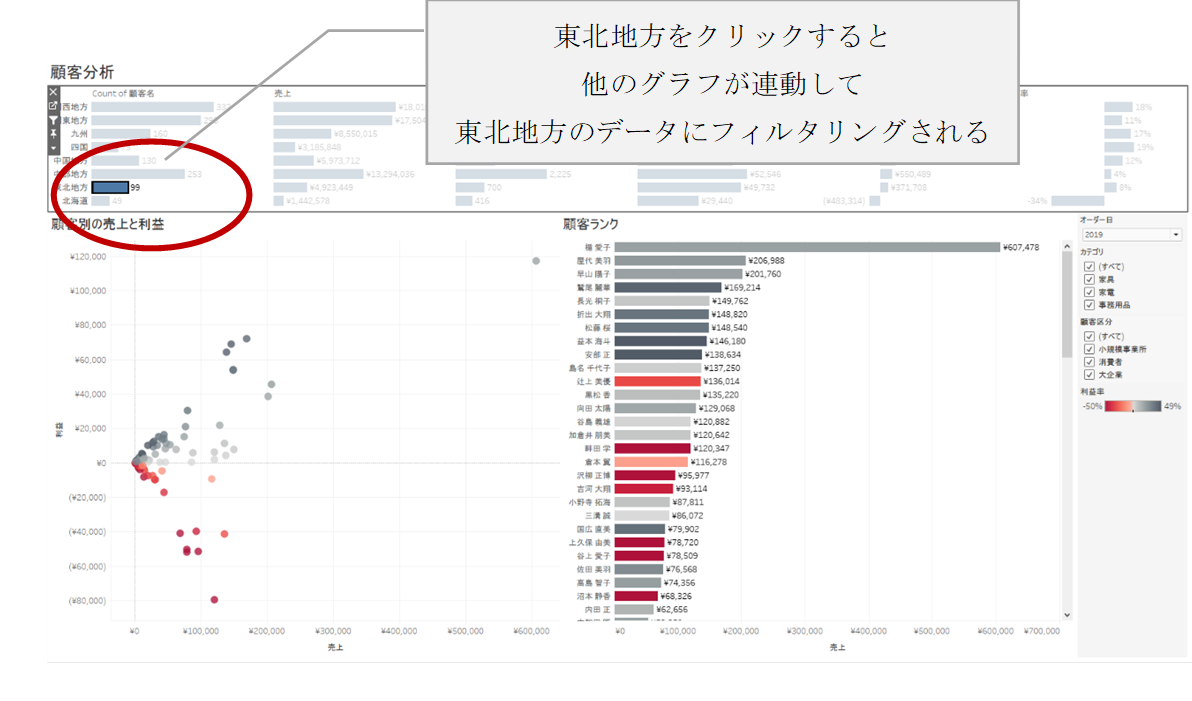(※エクセルでも1画面で複数の表やチャートなどを頑張れば表現できるとは思いますが、上記のようなアクションをつけることはできません)
