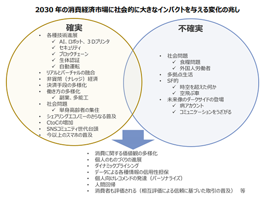 最新技術(AI、ロボット、3D プリンタ、自動運転)の進展や電子決済をはじめとした金融・経済に関わる新システムの構築が行われる。(確実な未来)また、多拠点生活など空間や場所にとらわれない新しい生活様式が展開されていく一方で、コミュニケーションツール・量の過多によるコミュニケーションの場から離れる人が増える。さらに、AI、ロボット技術の発展により生み出された余剰時間が「より人間らしい活動の追求」への時間とされていく。(不確実な未来) また現在、普及が進んでいるシェアリングエコノミーやCtoCはさらに拡大、SNSコミュニティでのやりとりが当然となっている世代が台頭し、スマートフォンの普及も拡大していくだろう。(確実な未来)。