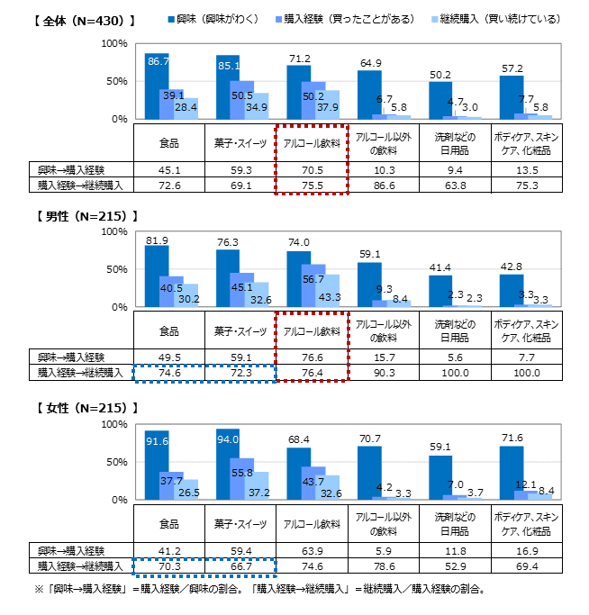 ■興味は「食品」がトップ。ただし、 興味から購入、購入から継続は「アルコール飲料」がトップ。 全体では、『興味』は「食品」「菓子・スイーツ」「アルコール飲料」、『購入経験』は「菓子・スイーツ」「アルコール飲料」、『継続購入』は「アルコール飲料」「菓子・スイーツ」の順となった。「食品」は興味が持たれるが、 「アルコール飲料」のほうが『興味→購入経験』『購入経験→継続購入』の歩留まりがよい。「菓子・スイーツ」も『興味→購入経験』の歩留まりが6割近くと高い。 性別でみると、「アルコール飲料」は特に男性の歩留まりが高い。「菓子・スイーツ」「食品」については、女性の『興味』は高いものの、『購入経験→継続購入』の歩留まりは、男性よりも若干低くなっている。女性は男性に比べて定着率はやや低いようだ。