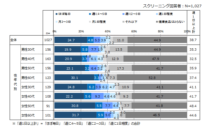 健康食品の頻度は「ほぼ毎日」が24.7%と2割以上であった。「週1日以上計」でみると約4割近くが健康食品を摂取している。一方で「健康食品はとらない」も44.9%であった。性年代ごとにみると、男女ともに年代が上がるごとに「ほぼ毎日」の割合が高くなる傾向がみられた。