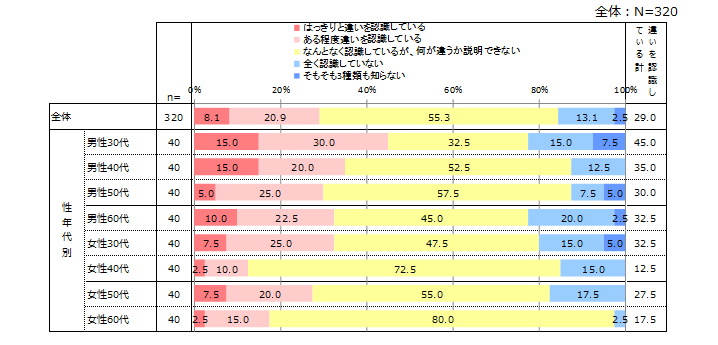 保健機能食品への認識は、全体の3割程度がある程度の違いを認識していたが、半数以上は内容までは理解していないことがわかる。性年代別にみると、女性よりも男性のほうが違いを認識していると思っている傾向がある。