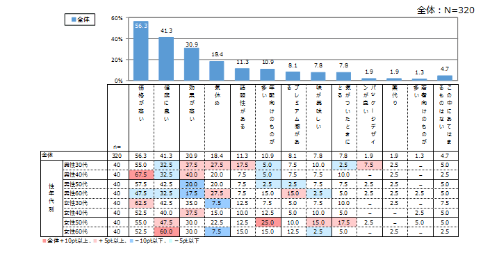 最も高いのは「価格が高い」56.3%、次いで「健康に良い」41.3%、「効果が高い」30.9%と続く。女性60代では「健康に良い」が最も高く60.0%であった。