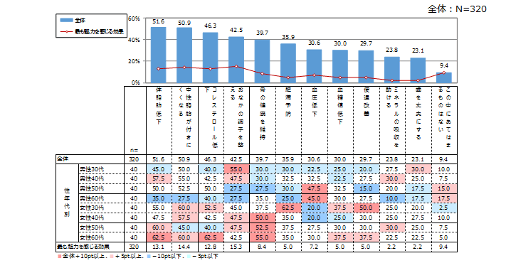 魅力を感じられているのは「体脂肪低下」51.6%、次いで「中性脂肪が付きにくくなる」50.9%といずれも脂肪への効果が高い。男性50~60代では「血圧低下」が高く、女性40代以上では「骨の健康を維持」が高い傾向がみられる。【最も魅力を感じる】でみると、「おなかの調子を整える」が最も高い。