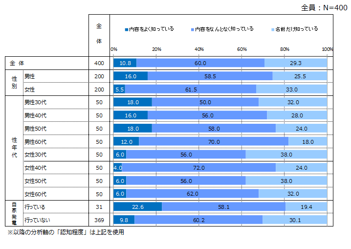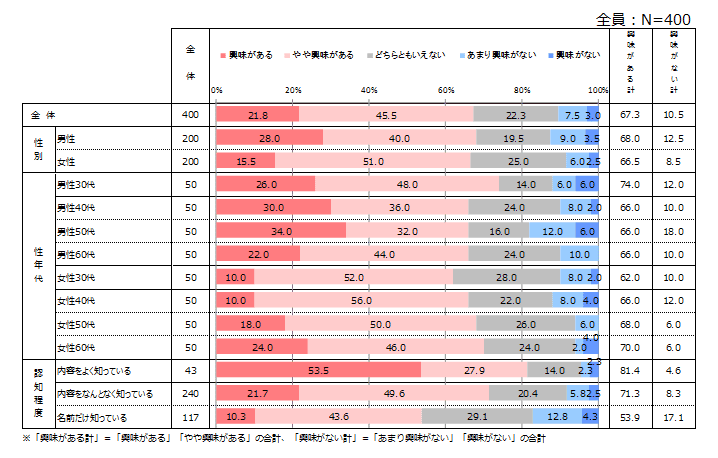 「興味がある計」でみると、全体の67.3%は興味を持っている。性年代別にみると最も興味度が高いのは男性30代で74.0%が興味を持っている。一方で最も興味度が低いのは女性30代で62.0%に留まった。【内容をよく知っている】では興味度が81.4%と非常に高く、認知程度が高いほど興味を持っていることがわかる。
