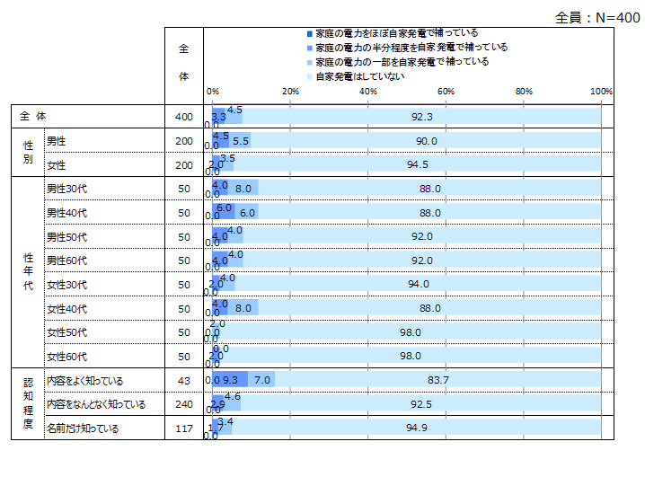 今回の対象者では、自宅で自家発電を行っているのは1割未満であった。認知程度が高いほど自家発電を利用している傾向がみられ、【内容をよく知っている】では「家庭の電力の半分程度を自家発電で補っている」が9.3%と高くなっている。