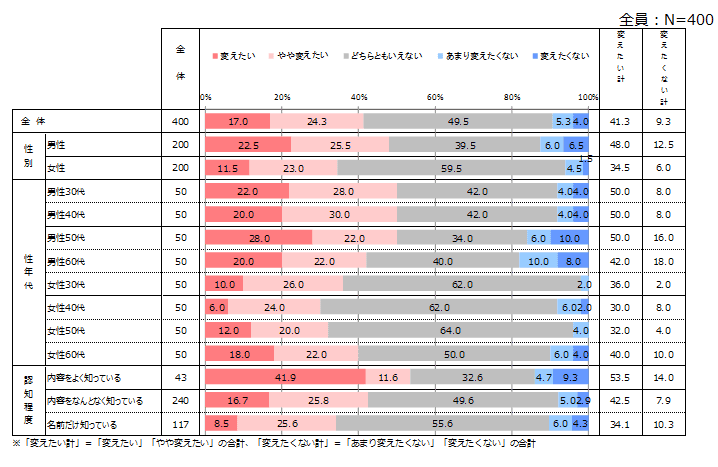 乗り換え意向者は、全体の41.3%であった。男性のほうが女性よりも乗り換え意向が高い傾向がみられる。また、認知程度が高いほど乗り換え意向は高くなっている。