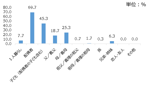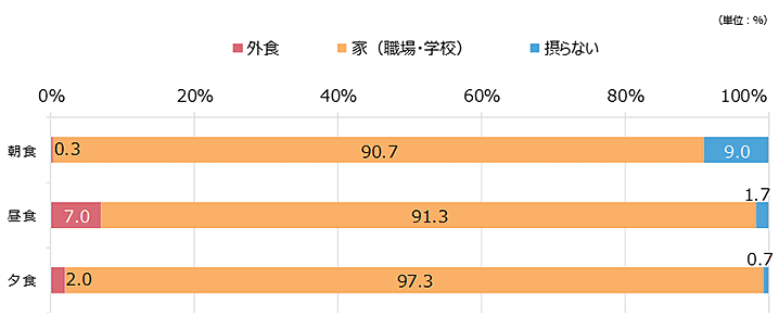 - 食事を摂っている場所は、「家(職場・学校)」が、朝食90.7%、昼食91.3%、夕食97.3%となる。