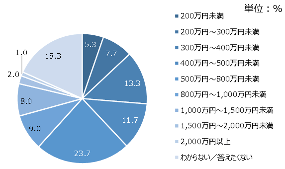 - 世帯年収別でみると、「3万円~4万円未満」は、「300万円~400万円未満」35.0%が最も高く、「200万円~500万円未満」が高い傾向にある。