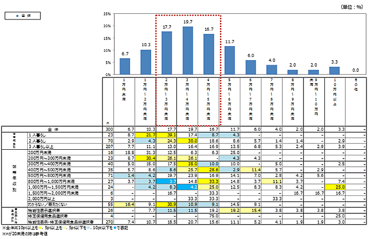 - 世帯構成別でみると、 「1人暮らし」では「1万円~3万円未満」、「2人暮らし」では「2万円~4万円未満」が高い傾向にある。