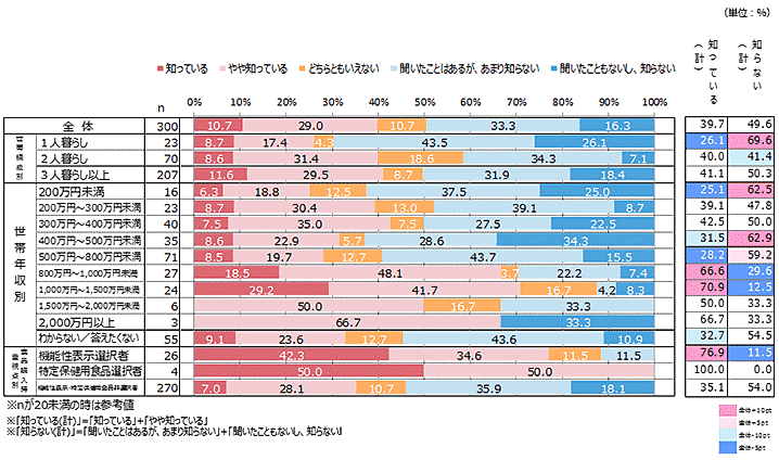 まず、機能性表示の「認知度」は、「知っている」39.7%に対して「知らない」49.6%で、非認知者が約10pt上回り、世帯構成別でみると、「3人暮らし以上」世帯が41.1%で最も高い。また、機能性表示の意味については、「理解していない」が半数を超える。