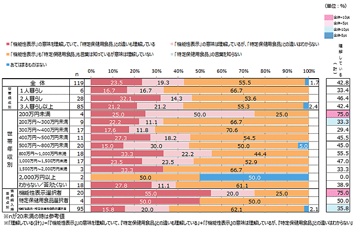 - 世帯構成別でみると、「2人暮らし」は「言葉の意味を理解し、違いも理解している」が32.1%、「機能性表示の意味を理解している」が46.4%と最も高い。