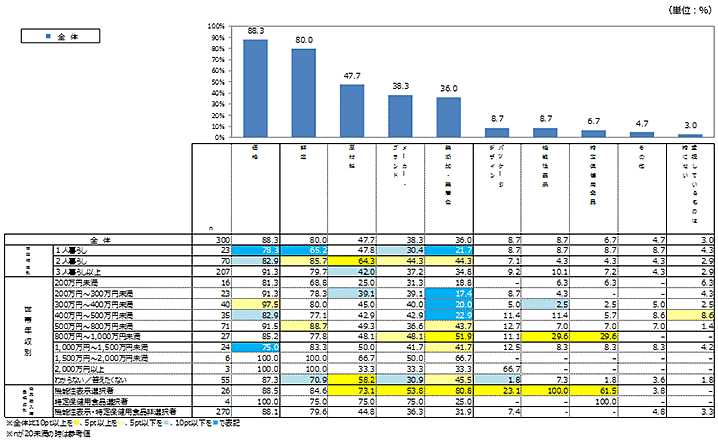 また「2人暮らし」は、「鮮度」「原材料」「メーカー・ブランド」「無添加・無着色」など、重視する項目が他の世帯構成に比べて多い。 - 食品購入時重点別でみると、機能性表示選択者は「価格」「鮮度」に比べて「原材料」「無添加・無着色」「特定保健用食品」などを重視する傾向にある。