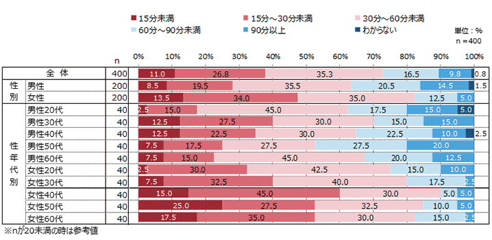- 性年代別でみると、「15分未満」は女性50代が25.0%、「15分~30分未満」は女性40代が45.0%、「30分~60分未満」は男性20代・60代が同率で45.0%、「60分~90分未満」は男性50代が27.5%、「90分以上」は男性50代以上が20.0%で、それぞれ最も高くなっている。