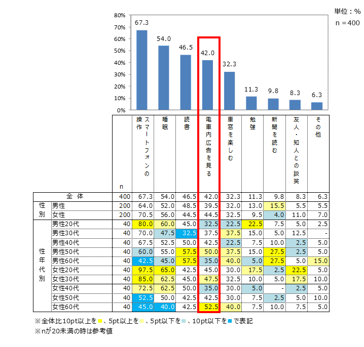 電車内での過ごし方、スマートフォン操作が約7割、電車内広告を見るは約4割