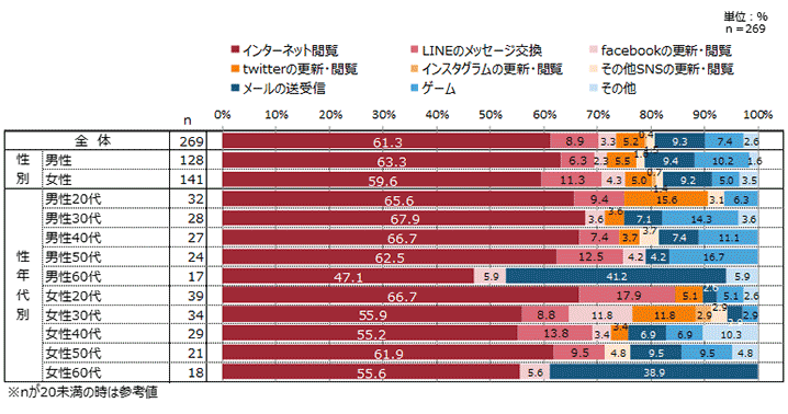 - 性年代別でみると、全体的に「インターネット閲覧」が高く、男女60代では、「メールの送受信」の割合も高い傾向にある。