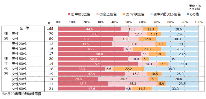 - 性年代別でみると、全体的に「中吊り広告」が高い。また、 「車内ビジョン広告」は、女性20代が38.9%、 「窓上広告」は、女性40代が35.7%で最も高い。