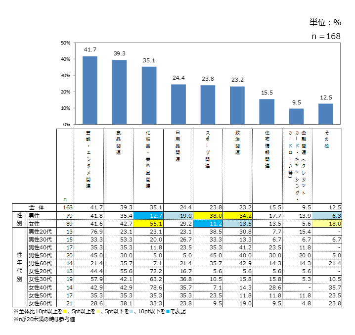 「芸能・エンタメ」「食品関連」「化粧品・美用品関連」が高い