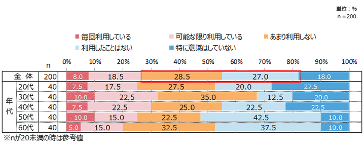 その内訳は、「毎回利用している」8.0%、「可能な限り利用している」18.5%、 「あまり利用しない」28.5%、「利用したことない」27.0%、 「特に意識していない」18.0%となり、賛成が多い割に、利用者は少ない傾向が見て取れる。