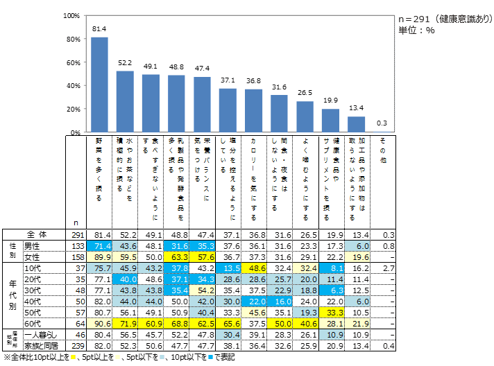 ■最も高いのは「野菜を多く摂る」で81.4% n=291(健康意識あり)