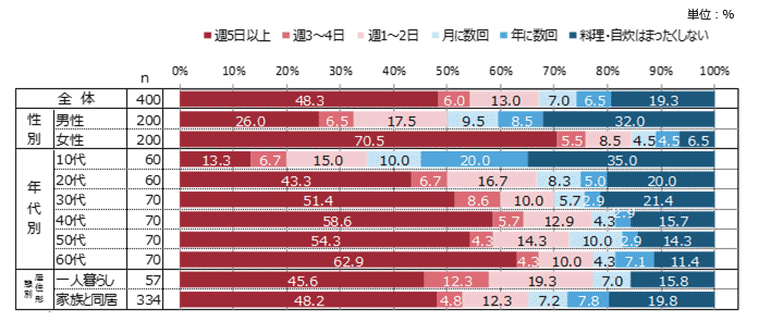 ・自宅での料理(自炊)の有無・頻度は、全体でみると、「週5日以上」が48.3%で、約半数を占めた。